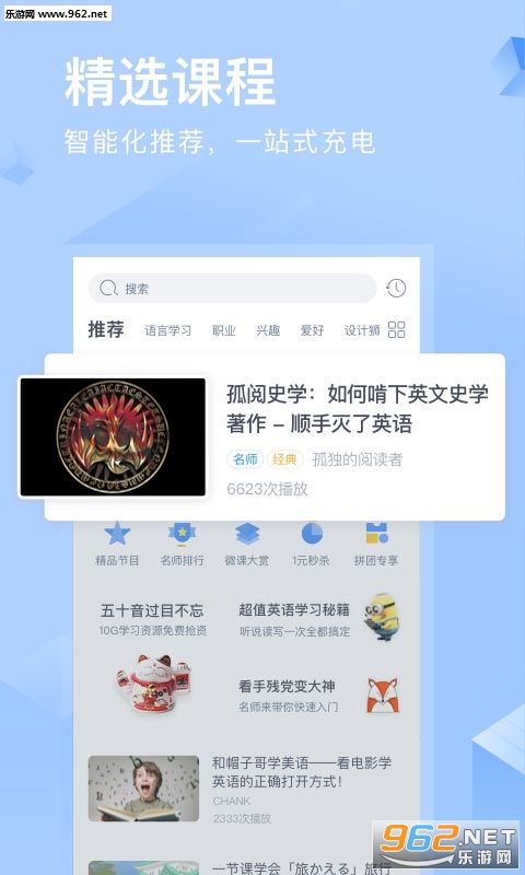 英日韩小语种、职场技能、考研考证、IT培训、设计摄影、绘画音乐、小学初高中精品课程任你选。