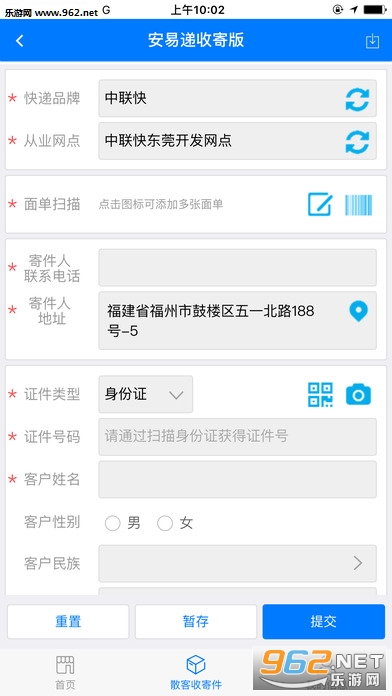 1.在“散客收寄件”页面,选择“证件类型”(默认为身份证)。有效证件包含身份证、驾照、护照。