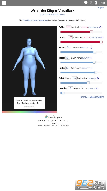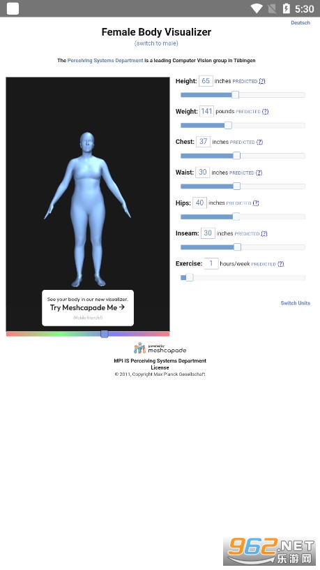 1、bodyvisualizer身材模拟器主要使用界面就是用户可以设置的人物提醒模拟图了,拉动蓝色条形方块标志可以自行设置参数,右上的DEUTACH是语言切换选项。