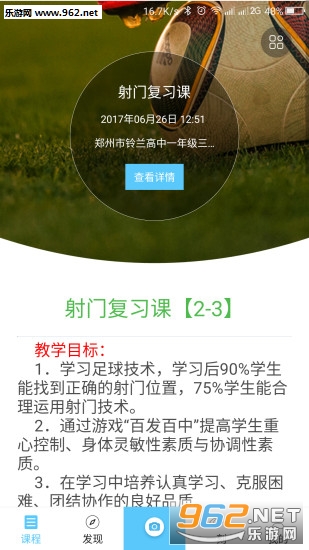 辅助教学、高效备课:对于足球教师而言,APP中的“课程”功能模块可实现高效备课,并有效提升课堂教学效率。课程安排一目了然,便于足球教师合理、有效地安排授课。优质教案轻松调用,教学目标、重点难点、教学用具、教学步骤随时查阅、备忘,无需打印纸质教案,省时省力,快捷高效。