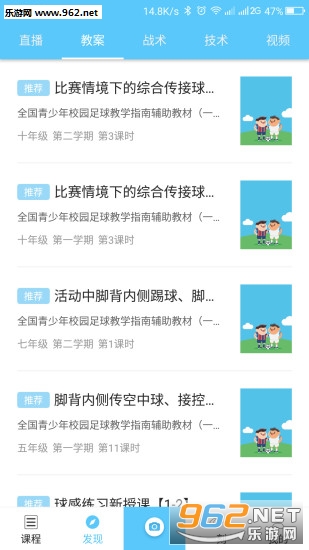 优质教案随时查阅:“校园足球”APP从一刻校园足球管理平台中的海量教案库中,精选出部分优质教案,按技术、战术、年龄等呈现形式分类展示。同时借助移动端的便捷,不受时间、地域的限制,便于足球教师有针对性地查找、观看足球技战术的教案和视频,从而更合理地制定教学计划,继而提高课堂教学质量。
