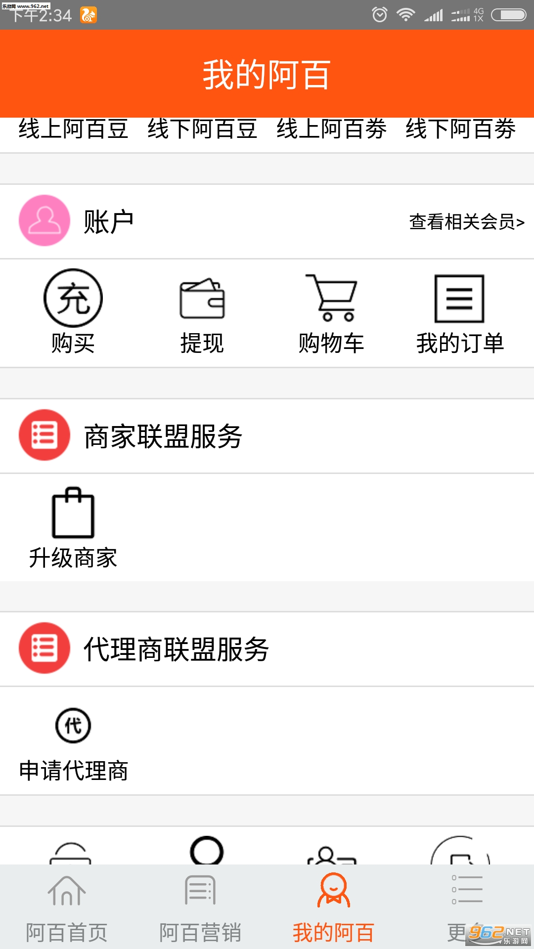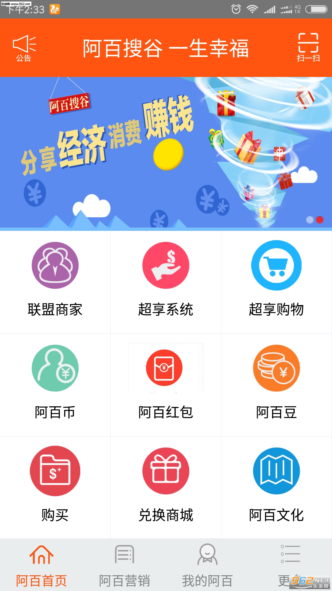 打开阿百搜谷APP,可查看阿百首页、阿百营销、我的阿百以及更多。