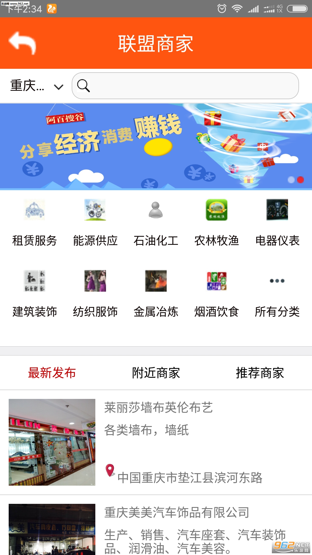 打开阿百首页,点击“联盟商家”按钮,进入“联盟商家”页面后可查看公司平台的所有联盟商家,可以在上方的搜索栏里面搜索联盟商家名称进行查找。同时也可以查看到最新入驻的联盟商家、附近联盟商家和本人推荐的联盟商家。点击商家可以查看更多商家详情。
