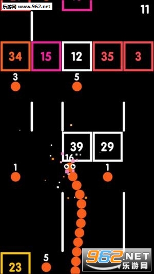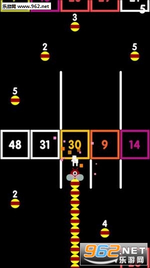 在球与块游戏中操控小球收集更多的小球,消灭砖块增长自己的长度。只有数字大于墙壁才能通过。你需要一边选择前进路线,一边计算你需要吃掉的小球个数,球与块游戏的关卡没有终点,一直持续下去,看你能累积到多少分数。