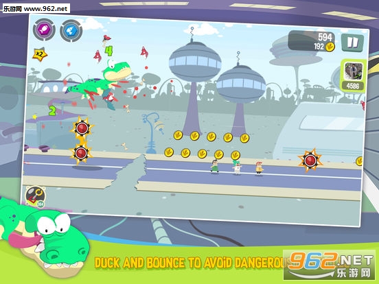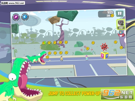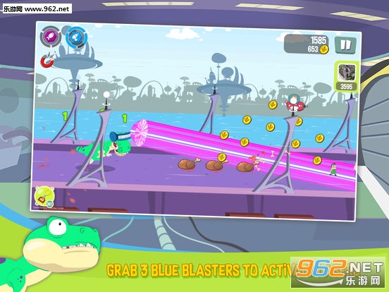 追加要素方面,除了能够提升技能等级的金币之外,我们在整个通关的过程当中还可以通过触碰场景中的神秘宝箱来获得超能力碎片或者增益BUFF,后者不必多说,无敌、磁铁、双倍金币等这些跑酷游戏的基本道具相信各位屏幕前的“老运动员”都已经非常清楚了,而超能力则是游戏的一个亮点,游戏中一共有“火箭”、“激光”、“狂暴”三种超能力,每一种能力都可以让主角变成相对应的霸王龙形态,只要集齐3个同类型碎片就可以出发超能力。因此我们在游戏当中如果想获得更高的分数,那么一定不要放过这些元素。