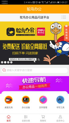 《鸵鸟办公》是一款非常专业的办公用品销售平台软件,软件内汇聚了各种你需要用到的办公运用,免费配送,还能领取优惠券,保证以全网最低的价格让你入手,只要扫码下单就会快速送到你家,一站购买齐全所有需要的办公用品!
