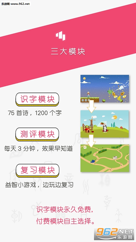 3)良心:作为一款幼儿识字软件,识字模块(共1200个汉字)永久免费,复习模块和测评模块才收费(用户自主选择是否付费)。其他的识字软件,都是免费学习几个字之后就要开始收费。
