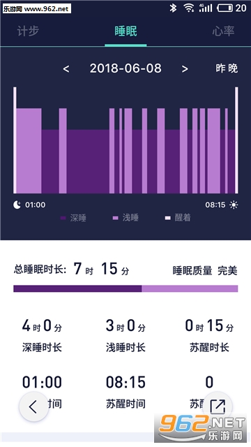 3、记录每天的睡眠情况,图文展示每天的深睡时间、浅睡时间和清醒次数。统计每周、每月的睡眠趋势。
