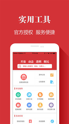 4、是个高能事务官。依托强大的移动互联网技术,以及与法院诉讼系统的有效衔接,把繁琐的诉讼事务变得简答快捷。想了解案件进展到什么程度,可以随手就查;要办理法院公告,四步轻松搞定;网上立案功能,不日即可上线。