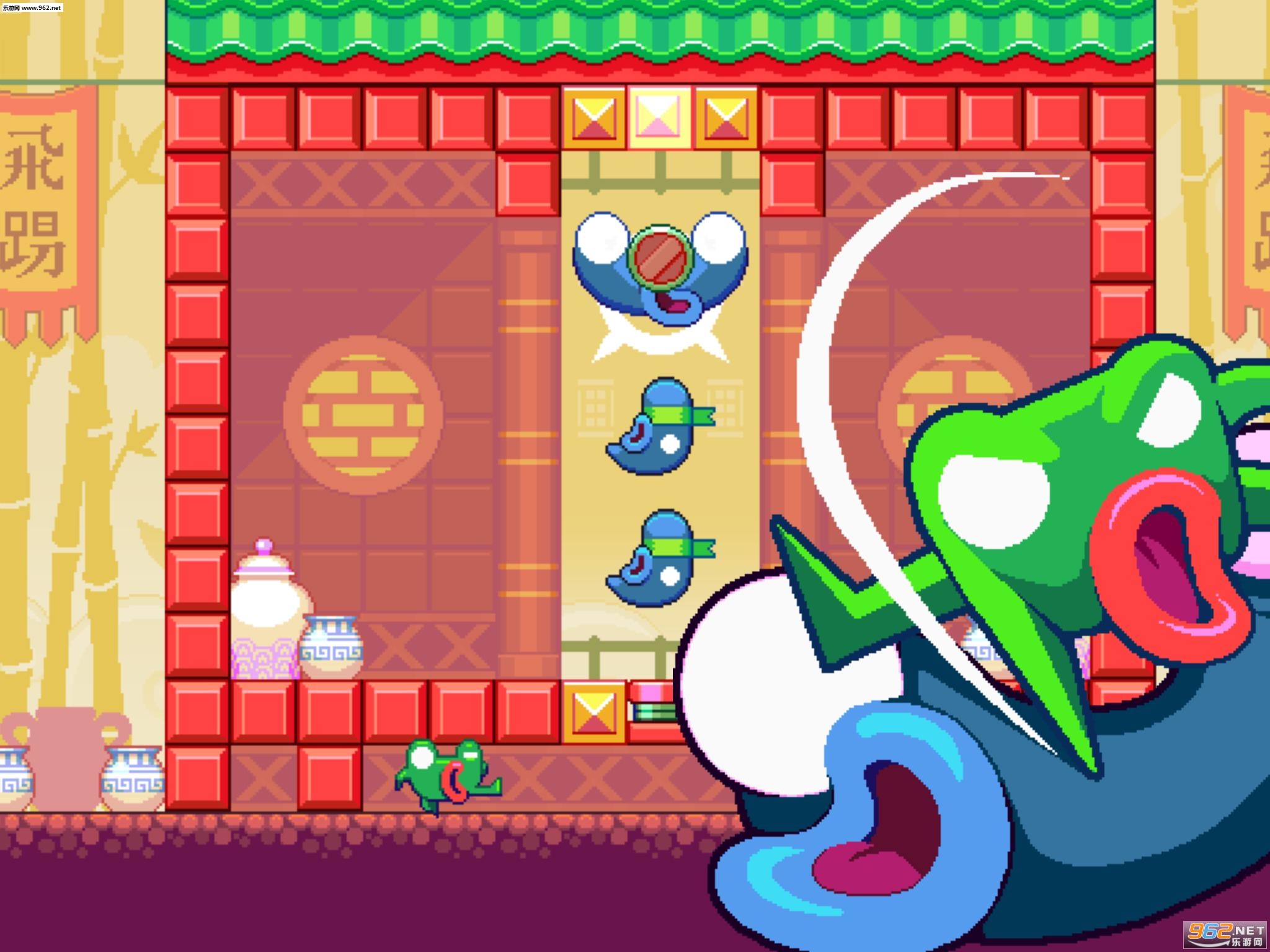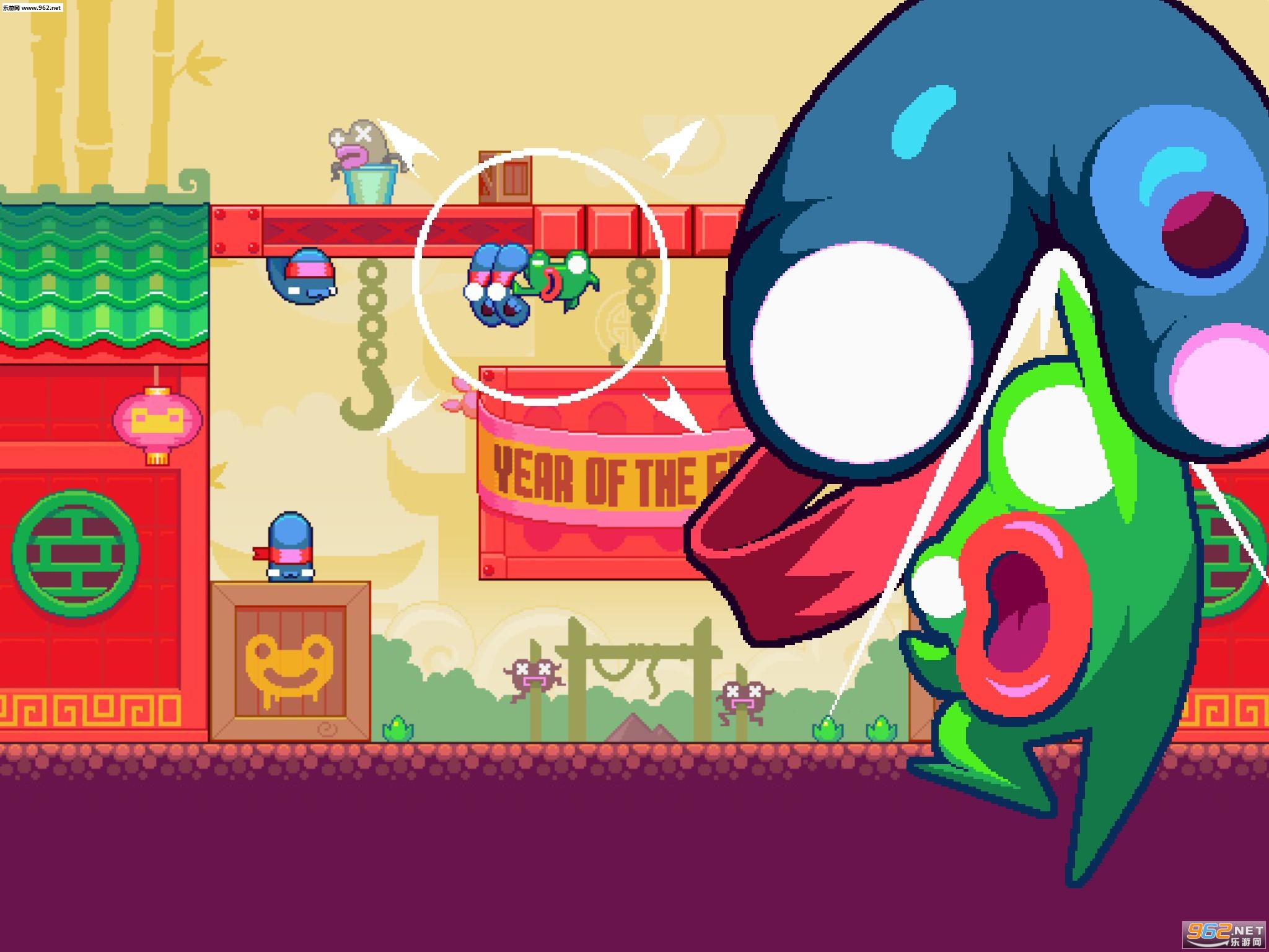 游戏开场时,主角青蛙君被一群满脸邪恶的忍者抓住,准备把它烤熟了吃,这时候青蛙君潜能爆发,一个旋风腿挣脱了五花大绑,并开始了复仇之路。游戏采用2D像素风画面,这正是Nitrome的拿手好戏,鲜艳的配色搭配上青蛙君飞腿攻击的打击感,以及向李小龙偷师学来的怒吼声,即使是像素风也表现出了丰富的人物神态,非常逗趣。