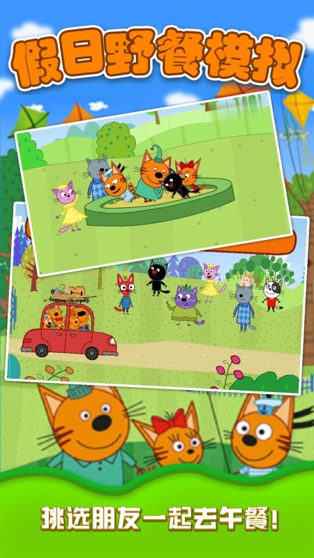 挑选你喜爱的小猫邀请参加野餐活动,每次野餐都可挑选不同角色。