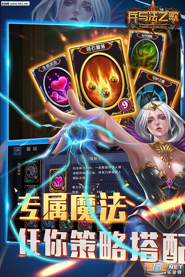 在《兵与法之歌》中拥10余种魔法卡牌,其中包括最具代表性的:召唤陨石、复活、冻伤、加盾、闪电等。这些魔法不仅拥有酷炫的特效带来的感观体验,同时也给玩家带来丰富的操作体验。