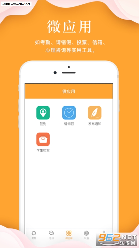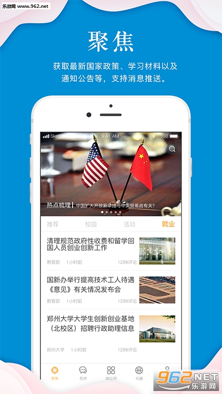 应用主要特色功能有:聚焦、思辩、玩趣等等,聚焦为指点天下的思想引导板块,核心是传播正能量;思辩突出正反方观点的碰撞,学生可自由发表言论;玩趣-校园圈为本校范围的学生动态圈,为学生提供发表动态言论的圈子。