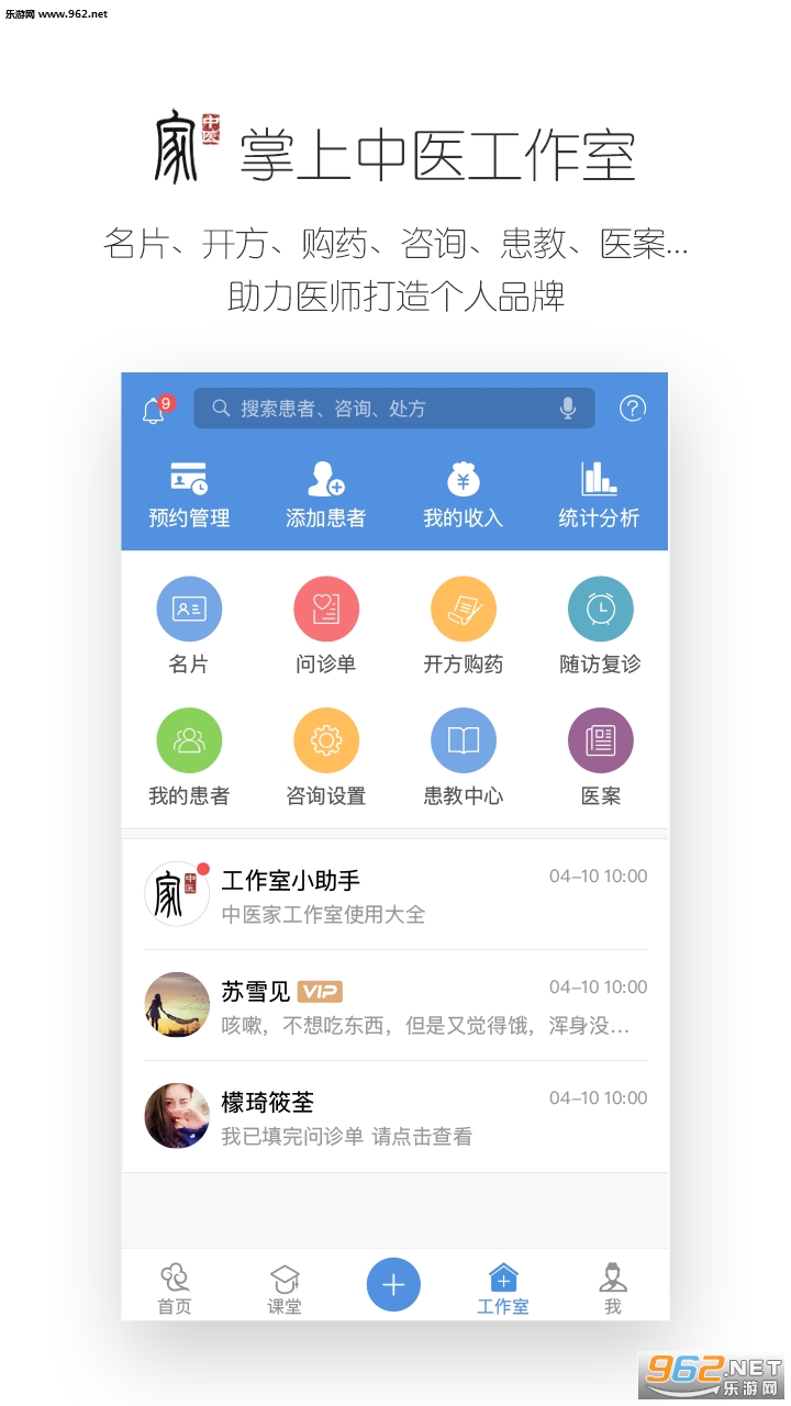 您的掌上中医工作室,帮助您进行患者管理,打造个人品牌,体现医生的价值,提供六大工具涵盖:名片,问诊单,处方助手,我的患者,医案,手记。