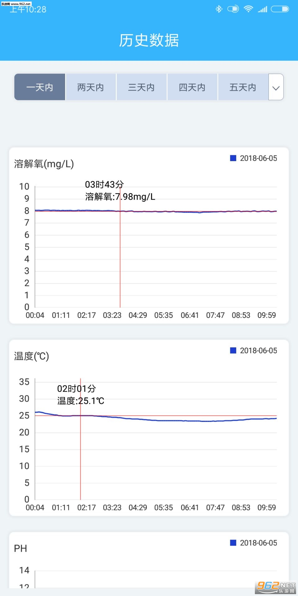 4.点击有设备的池塘进入到池塘设备详情界面,可以看到设备的状态,可以查看该设备检测的水质历史数据,可以控制设备以及查看池塘的创建信息;