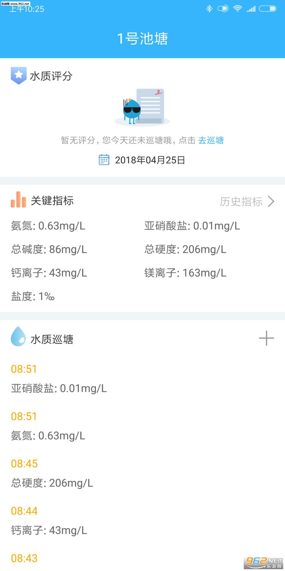 2.点击巡塘首页任意池塘进入该池塘的详细信息界面,比如:关键指标、水质巡塘、投饵记录、用药情况等信息,用户可以添加修改查看这些信息以更好地了解自己的池塘和记录自己的工作;
