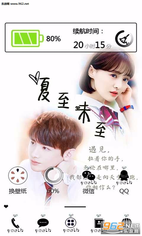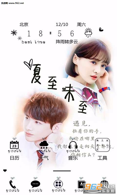 《夏至未至青春未央手机主题》是一款为安卓手机用户打造的手机精美主题,手机是我们经常使用的工具,一个好的主题能够让你心情舒畅,开心每一天,小编今天为大家带来的是关于爱情的唯美主题。