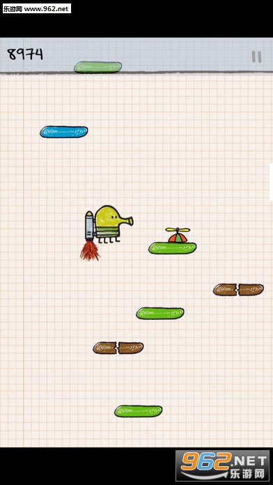 在玩法上依然延续了以前作品的经典,控制涂鸦小怪物不断向上跳跃即可,最后以分数看实力。但是在跳跃过程中还要尽可能多的收集钻石才行,钻石不但能增加分数还能帮助玩家复活哦。还有就是沿途不断出现的拦路的小喽喽,玩家既可通过高超的技术绕过去也可直接点击屏幕进行射击。此外,脚下的跳板并不都是固定的,有些踩一次就会消失或者爆炸,玩家一定要格外小心才行。