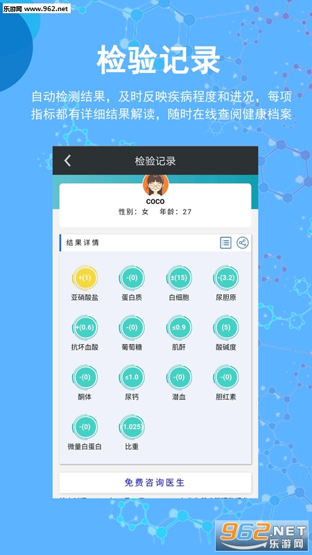 检测中心---随时使用智能手机扫描,进行尿液14项、阴道炎六联检、便潜血、小儿腹泻等项目检测,检验记录自动保存,并可进行趋势分析,随时监测健康状态。