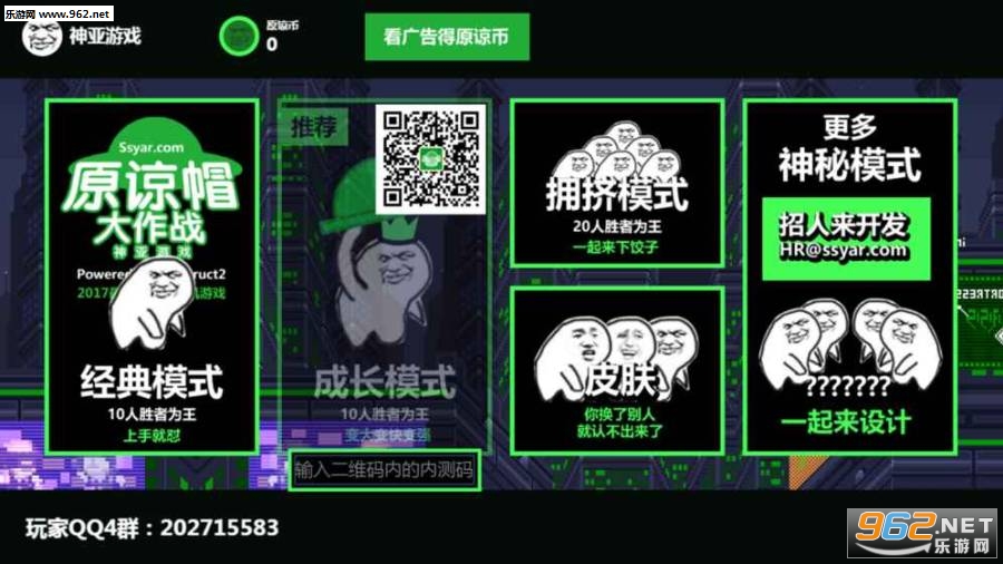 《原谅帽大作战多人联机版》来自神亚游戏打造的竞技类游戏,这次是真的上线了,来源于网络恶搞的表情包系列,现在推出的.IO风格的玩法,并且相对于网页版,加入了拥挤模式,成长模式供你选择,更刺激的丢绿帽子大作战。