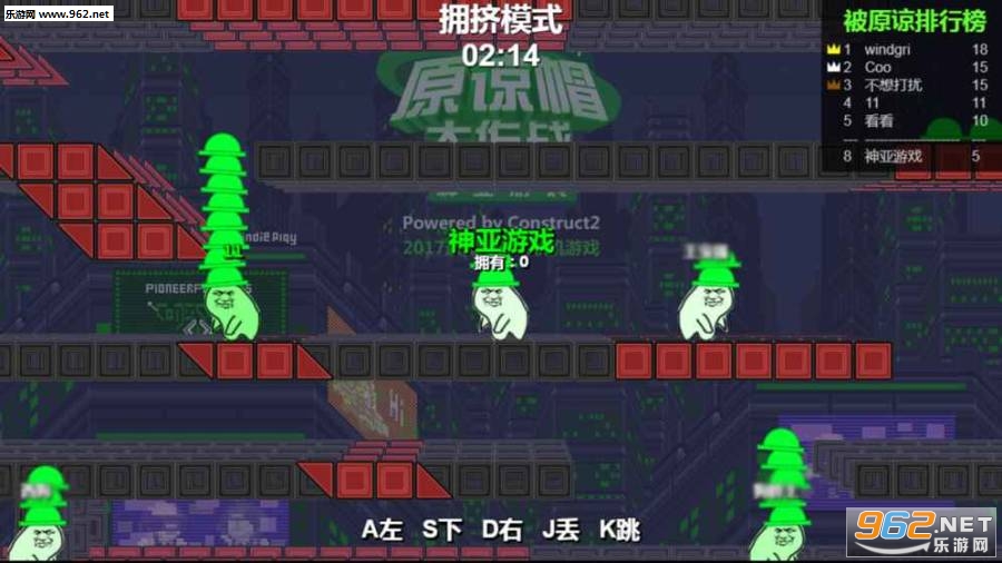 游戏的玩法和操作都非常简单,只需要在各个平台间跳跃,捡起地上的绿帽子仍在对手的头上,控制方向,然丢帽子,键跳跃。玩家持有的绿帽子数量有限,扔一个少一个,但可以通过捡地上的帽子来补充“弹药”。此外,抛出的绿帽子都会以抛物线的方式下坠,控制好距离和高度非常重要,不然就非常容易“绿人不成反被绿”。
