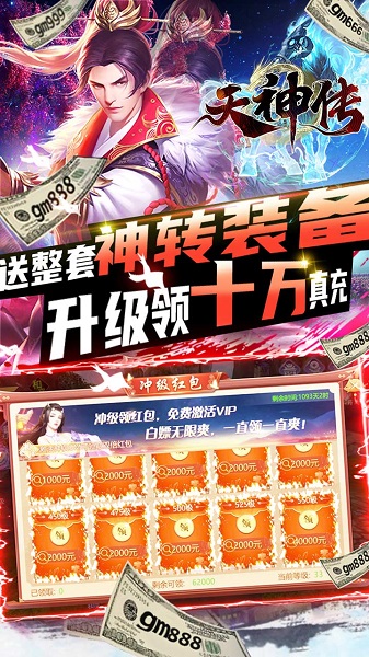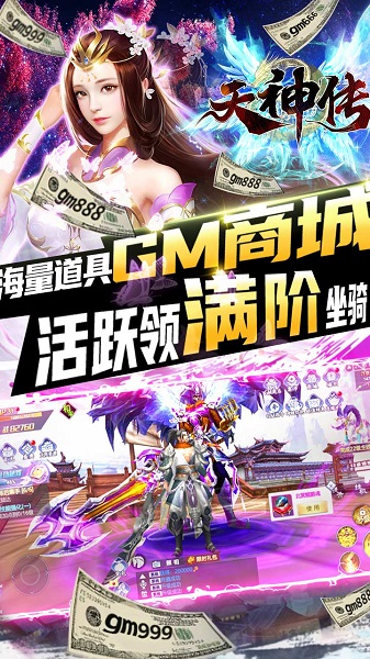 《天神传(GM指令商城)》是一款跨时代武侠手游巨作,恢弘场景顶级品质,清新浪漫的画风,全3D唯美画质,720度无死角视野,打造属于你我的江湖。风云变化的江湖,全新GM版本,上线满V、200W元宝、100W绑元。兄弟一起共创属于自己的亲密家族,绚烂多情的武侠世界,唯美浪漫的情缘从此展开。游戏简介: 后缀福利说明:升级领10万充值,在GM福利输入:gm888、古币指令:bug指令:gm666、真充指令:gm999,可获得相应特权。