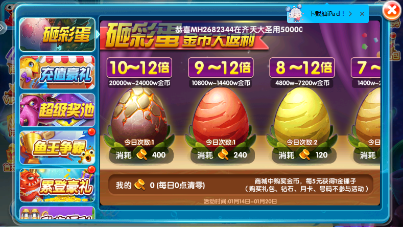 高炮倍,高爆炸率,高奖励,高福利,高质量、让你体验极致捕鱼乐!