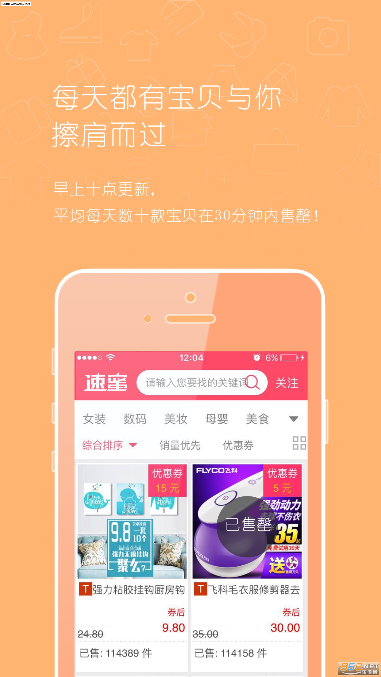 速蜜app是一款专注为用户提供淘宝天猫最新,最实惠的高品质优惠券,帮助用户用最优惠的价格买到心仪的商品,收录商品均经过人工审核。服装鞋帽,居家文体,箱包配饰,数码母婴,应有尽有。