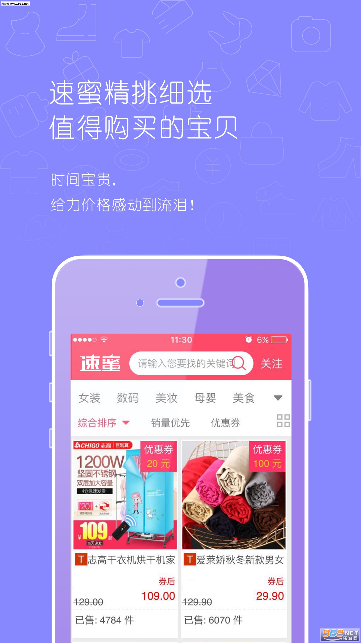 《速蜜app》每天更新千万款淘宝天猫优惠券,实时推送电商网购优惠信息,是您购买高性价比商品的省钱利器。用户可以很方便的领取优惠券淘到自己喜欢的商品,商品类型从服装、百货、鞋包配饰应有尽有,主打高性价比的优质商品。