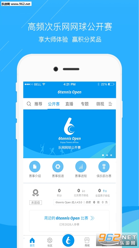 乐网网球,乐在参与 Enjoy Tennis@You,全球60多个城市举办的6tennis Open,上万名选手用乐网网球APP管理比赛,还有丰厚的积分和奖品,是家门口的快乐大满贯!