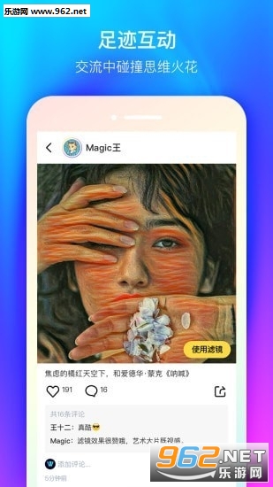 一款专注于魔幻向滤镜拍摄的手机app!不仅支持多种风格拍摄,更可以让你在这款软件中享受到一键快速分享你的作品的便捷!感觉不错的话就赶快下载软件开始使用吧!