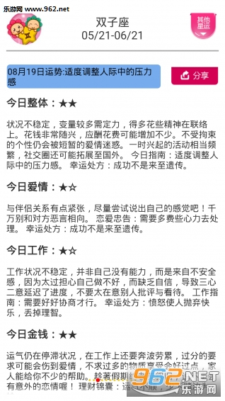 1、【每日运势】专业的星座大师每天准时对每个星座当前的整体运势、爱情、工作、金钱都作了评分及详细的解说