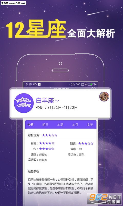 《星座运程2026》这是一款有魔力的星座运势查询软件。最详细的星座知识,最全面的星座运程信息,为用户提供爱情、工作、财运等多方面的星座运势查询服务。走过路过,不要错过!