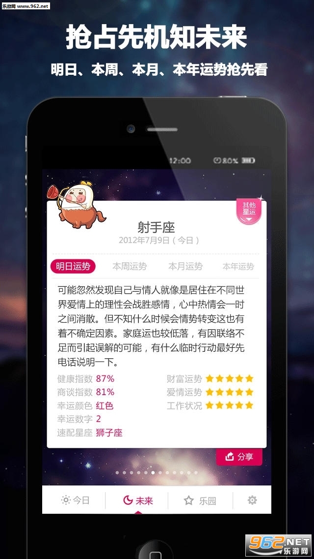 4、快速了解你每日最幸运的颜色、最幸运的数字、爱情运势、理财指数让你出门万事俱备。