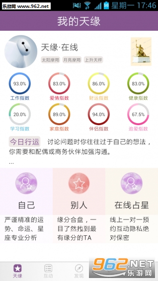 天缘在线app一款在线占星师互动软件,提供多名占星师发帖互动服务,轻松查看自己星盘秘密,尽在天缘在线app!