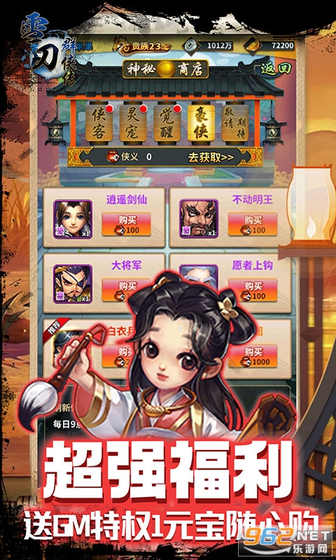 1、上线就送贵族24(需要在活动-登录送礼领取第一天的奖励)免费开始GM特权,红侠、金侠全部只需1元宝,助您体验最刺激的武林江湖战斗!