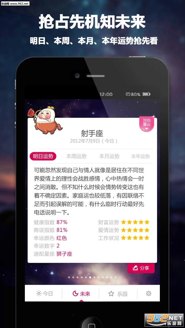 你是个星座迷吗?想了解自己每天的运势吗?想用它来指导自己的生活工作或爱情吗?那就来下载试试吧,为你带来不一样的每一天!