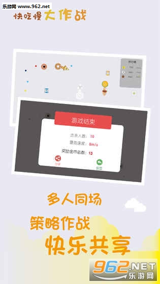 《快吃慢大作战》是一款多人同场竞技游戏,是一款新玩法的io游戏。类似球球大作战的玩法带给玩家最经典的游戏乐趣哦,游戏中玩家可以不断吞噬其他玩家,让自己变得更加的壮大,游戏中还有各种炫酷的皮肤,让游戏过程变得更加的精彩!