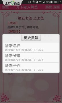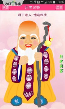 在神仙的家族中,有位专管人间婚姻的月下老人,传说,谁与谁能成夫妻,都是月下老人事先用红绳系足选定的,前世今生,情爱姻缘何从起,情签爱运因果由,月下老人爱情灵签让您爱情圆满!