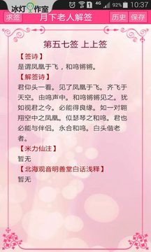 《月老灵签姻缘签》是一款可以帮助大家算姻缘的神签,月老作为签红线搭姻缘的神仙,对姻缘签非常的准。月老为大家指点婚姻、爱情、桃花运势等等。下面就是小编为大家带来的月老灵签测试!