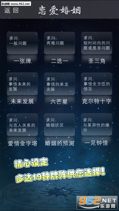 让来自欧洲的古老占卜塔罗牌解答你心中的疑虑和迷茫吧,为你提供爱情,事业,家庭等经典流行的占卜类型。