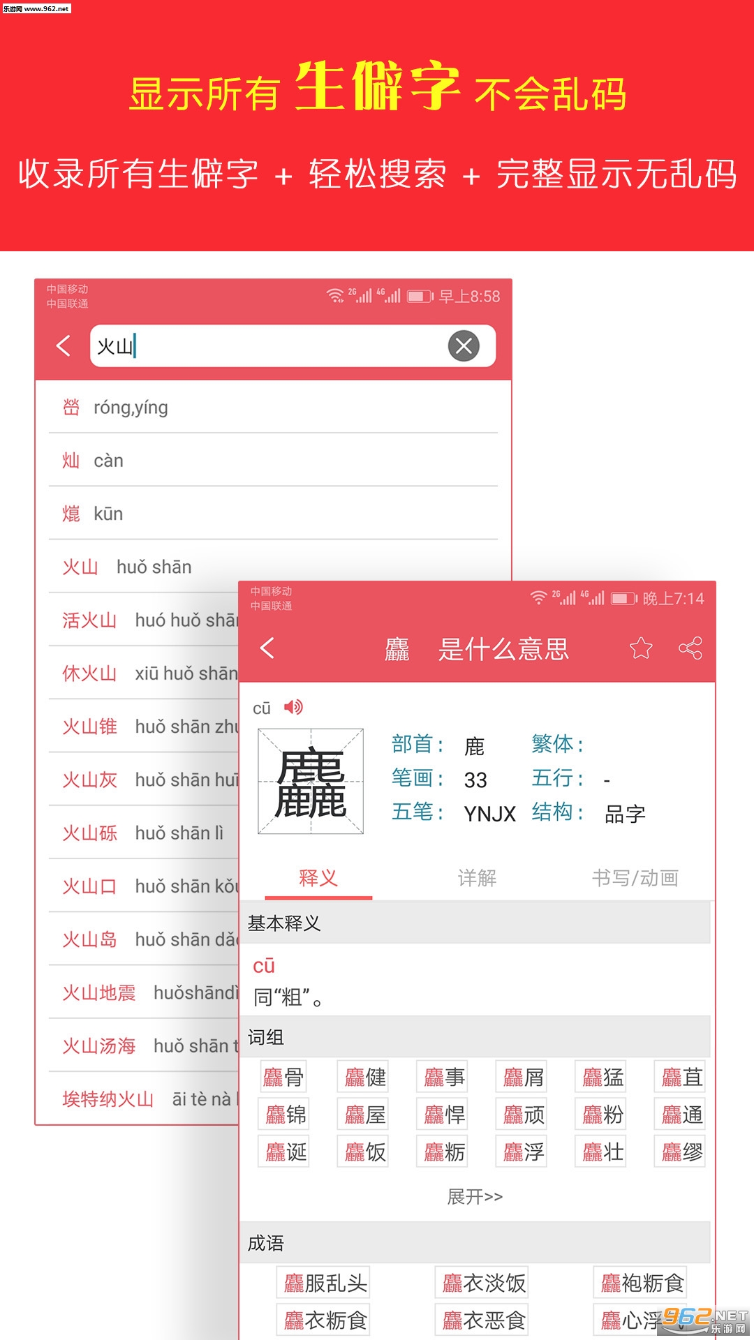 ○ 实用的拆字搜索与逐字搜索功能(如搜索:火山:灿)。