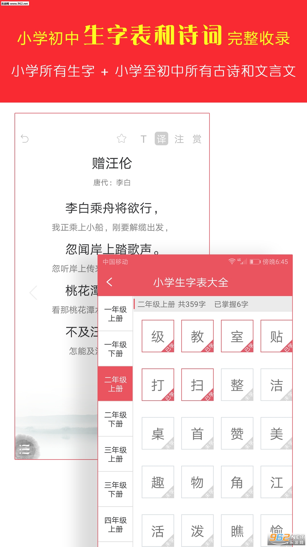 ○ 初中1-3年级学生。通过软件中对应课本的所有古诗词、文言文、每日成语、每日古诗词等...教学生真正理解每一个汉字,巩固汉语汉字知识。