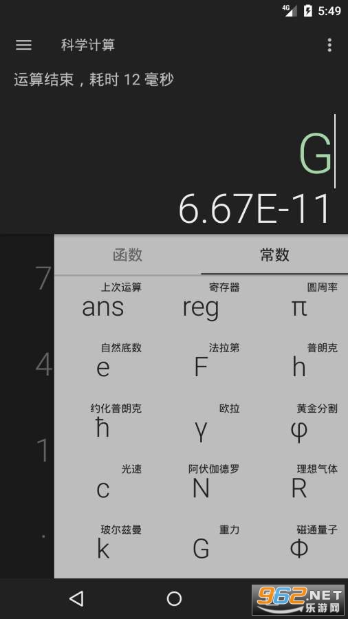 界面右侧向左滑动即可打开函数和常数的界面更多的数字与符号:界面中所有的的按钮区均可向上滑动以显示更多的按钮