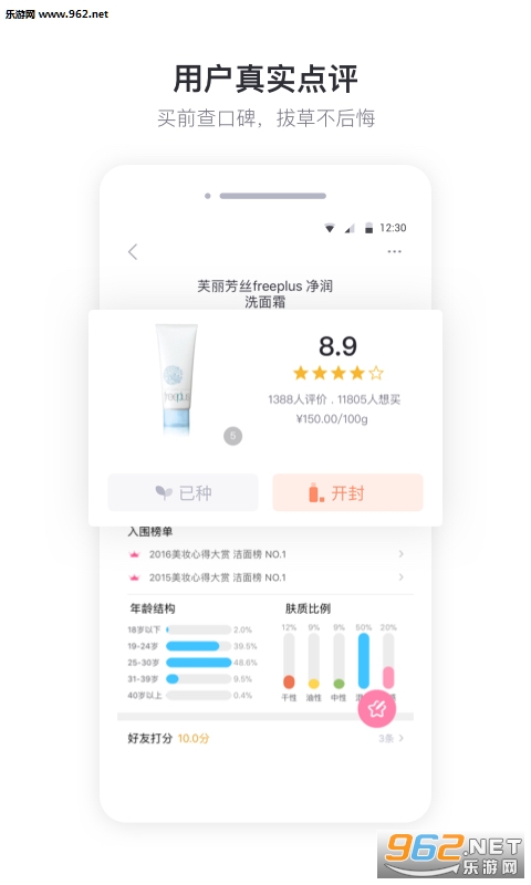 产品库覆盖了10万 的化妆品,汇聚了6000多万真实用户,已产生了4000多万的口碑数据,是中国权威的化妆品消费指南,已成为消费者选购化妆品必备APP。