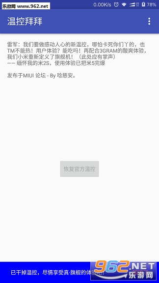 2、与【改温控文件】方式相比,优点是不需要第3方REC、无需解锁system、即时生效&还原、无需重启、不影响OTA升级(使用MIUI官方ROOT时,内测/体验版福音),但需要授予本程序ROOT权限(BL锁机型要先解锁BL);