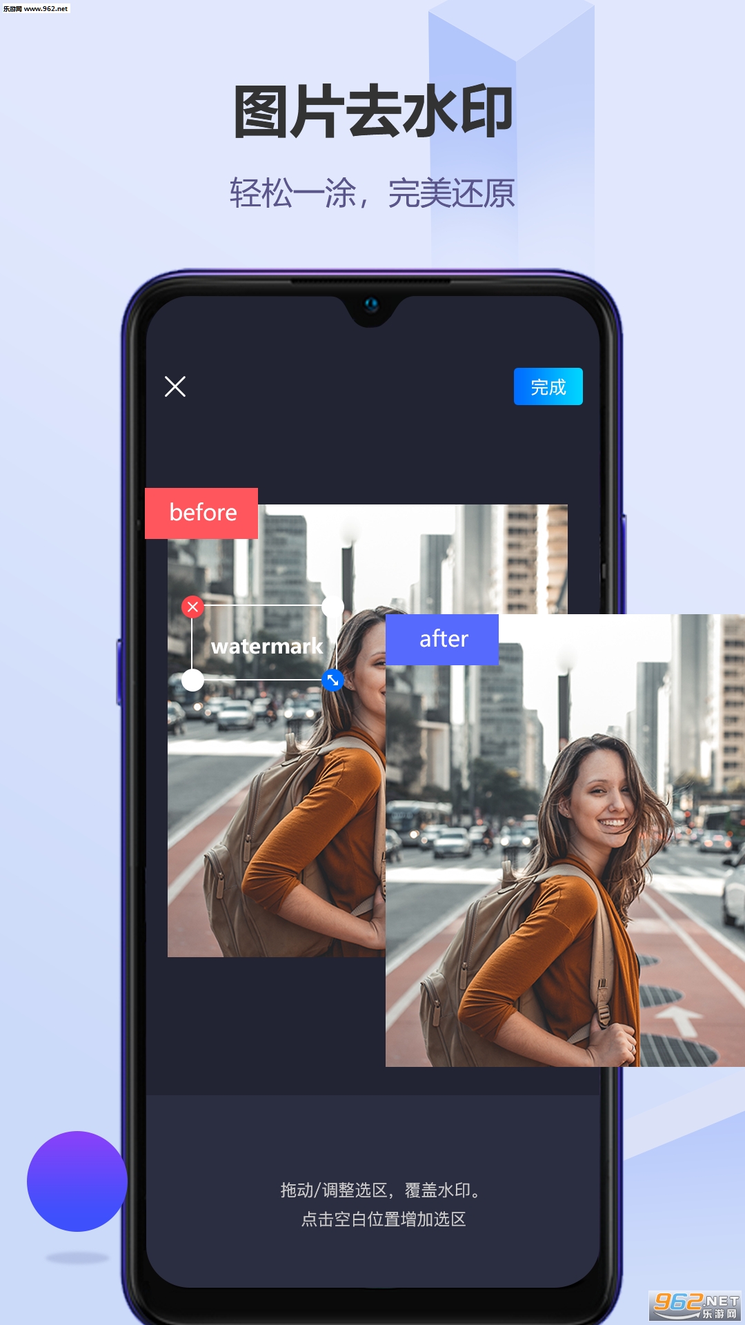 《无痕去水印安卓版》是一款非常方便实用的去水印工具,操作方式还是很简单的,功能也十分的丰富和齐全,用户们通过轻松的手指点击即可操作,感兴趣的亲们赶紧下载吧。