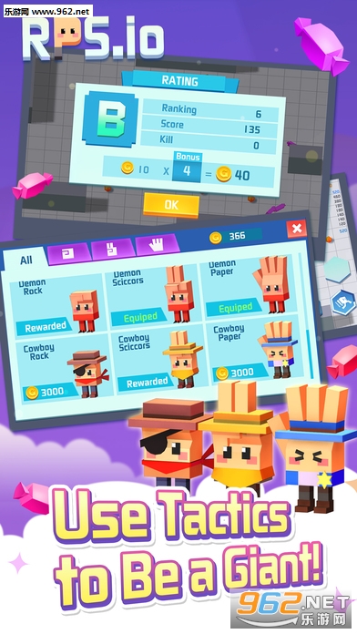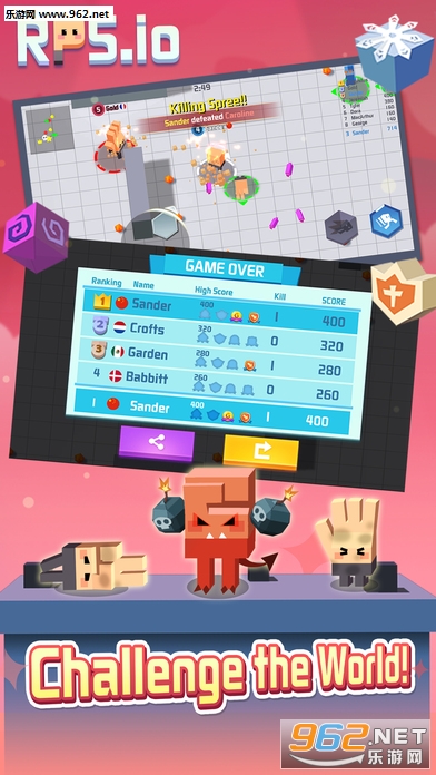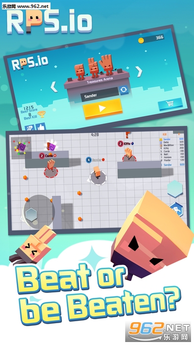 玩家在游戏内扮演剪刀,石头或布融入了全民猜拳规则在竞技场中击败敌人, 躲避天敌。解锁高级场即可体验道具作战乐趣,使用花样道具击败敌人,登顶竞技排行榜。