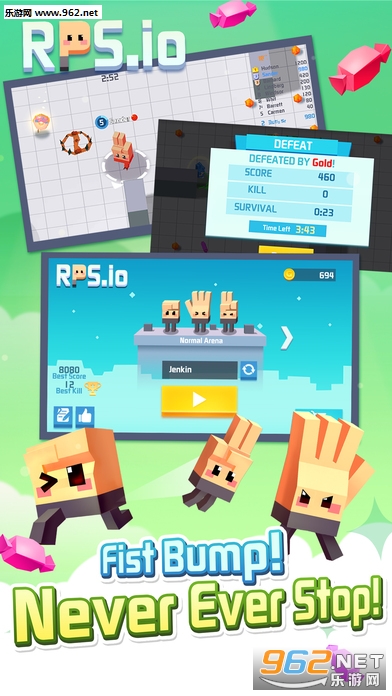 奔跑吧,石头;战斗吧,剪刀;冲刺吧,布;长脚的甜甜圈君,体力糖果条;多样皮肤商城:牛仔系,恶魔系,武道系,快来收集吧!