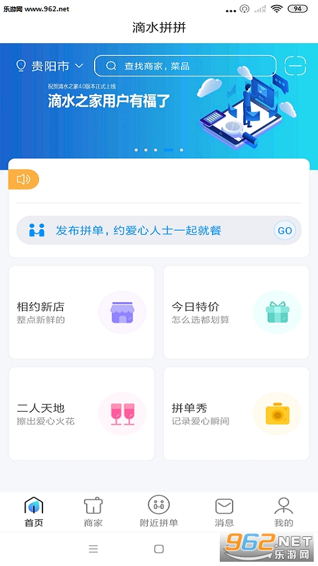 滴水拼拼是一个为用户提供餐饮、娱乐消费等线上预订的平台!同时为用户提供多种个性化消费方式,满足多层次消费需求!为客户带来美好的体验和生活中的方便,客户可以通过发布拼单很拼友一起进行进餐,交友,扩展交际,丰富生活。
